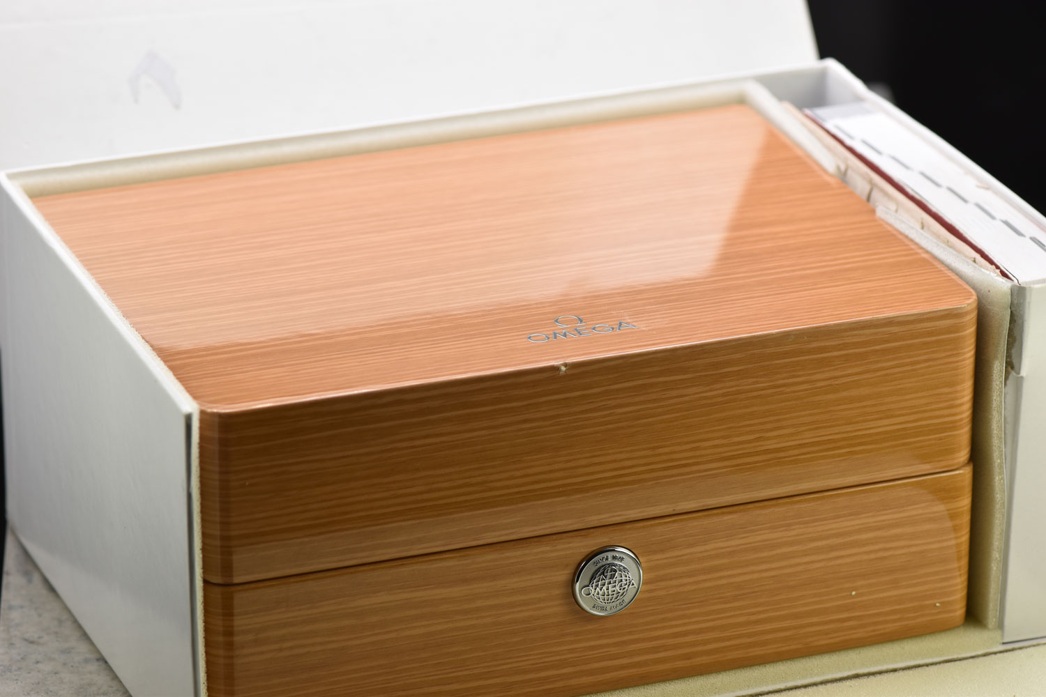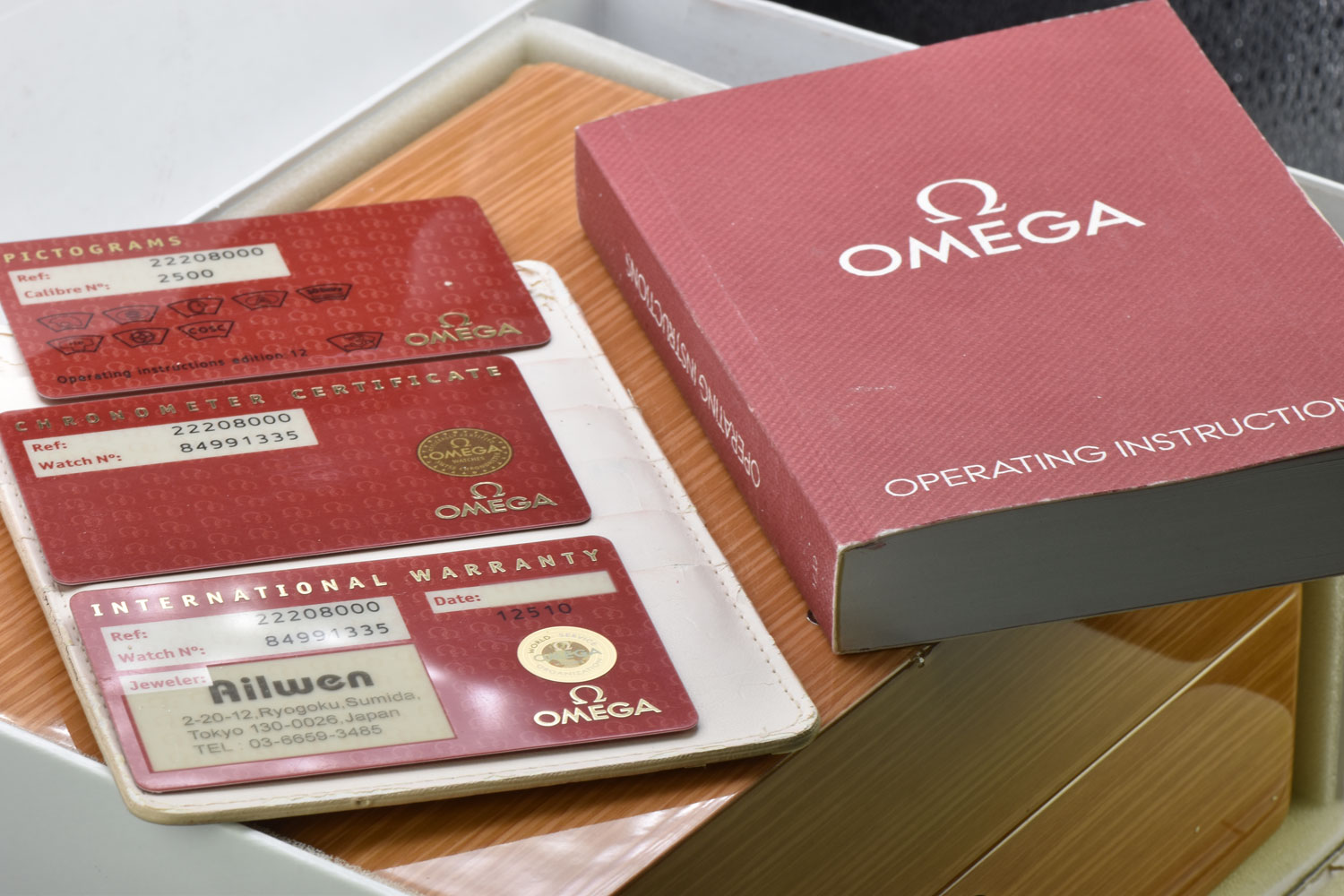 Includes: Inner & Outer Omega Boxes, Manual, Leather Card Holder, Warranty Card, Pictograms Card, & Chronometer Card! (Warranty Card Stamped By Authorized Dealer) (Inner Box Fabric Is Peeling)